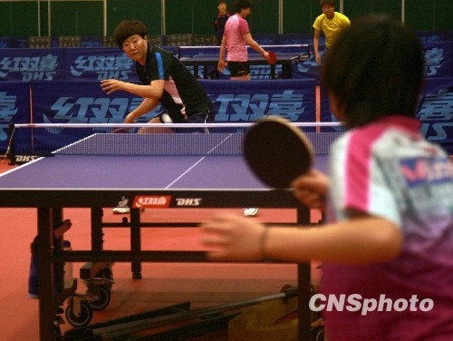 4月7日,主帅施之浩携中国女乒32名队员抵达河北正定国家乒乓球训练基地,开始为期一个月的封闭训练,以备战5月23日在莫斯科举行的第50届世乒赛团体赛。主教练施之皓透露,从今年年初至上周末,中国女乒共进行了3次“直通莫斯科”选拔赛,郭跃、刘诗雯和郭焱分获三站冠军,直接获得世乒赛参赛资格,另外两名将在此次集训中产生。图为中国女乒队员郭焱(左一)正在刻苦训练。中新社发 翟羽佳 摄