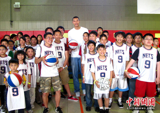 4月8日,效力于NBA网队的中国球员易建联来到纽约唐人街容闳小学,与华人社区的学生们近距离互动,并向孩子们解说篮球比赛规则、示范基本动作。主办单位美中文化基金会会长李丽表示,希望藉由本次活动,让华人社区学生、特别是来自低收入家庭的学生,也有机会接触篮球,体验运动文化。中新社发 魏晞 摄
