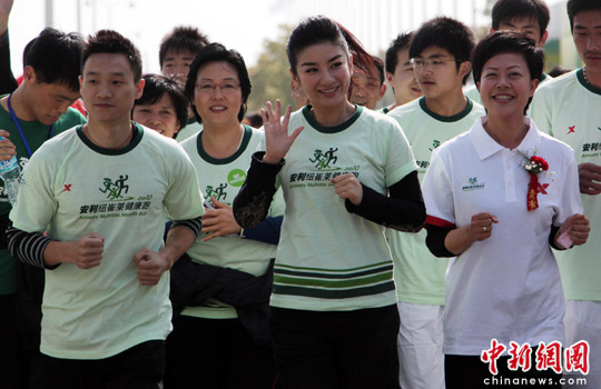 4月17日,为迎接第四届全国体育大会倒计时30天,奥运冠军杨威、影视明星黄奕在安徽合肥体育中心为万人健康跑大军领跑。中新社发 张娅子 摄
