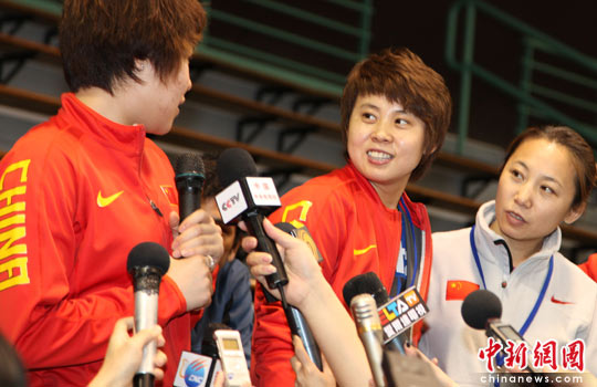 5月4日,中国大陆短道速滑名将王濛在台北接受中新社记者专访,透露她不会急流勇退,下一步是继续滑冰,帮助年轻运动员做点事,年内将上一所大学,充实自己的文化知识。图为王濛(中)与队友周洋(左)、著名教练李琰一起,在台北小巨蛋滑冰场接受记者采访。中新社发 董会峰 摄