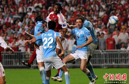5月11日晚,亚洲足球十六强赛在香港大球场举行。图为香港南华队(红)在与巴林阿尔利化队(蓝)激烈争夺。中新社发 郑祚声 摄