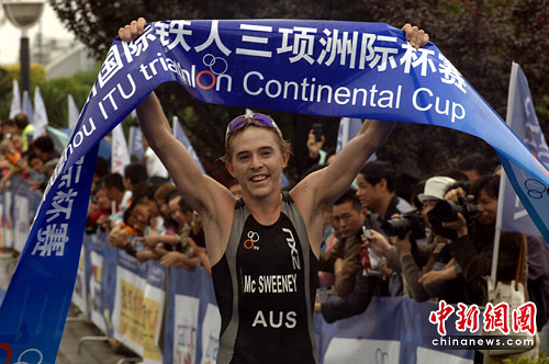 5月15日,澳大利亚选手安东尼·麦克斯威尼在观众欢呼中冲过终点夺得冠军。当日,2010年福州国际铁人三项洲际杯赛暨全国铁人三项冠军杯系列赛在福州举行。 中新社发 王东明 摄