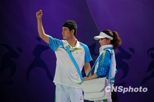 5月18日晚,广州亚组委在天河体育馆发布官方制服,图为模特展示亚运制服运动装。中新社发 柯小军 摄