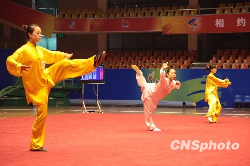 5月19日,第四届全国体育大会健身气功比赛在安徽省体育馆落下帷幕。图为八段锦女子个人比赛瞬间。中新社发 韩苏原 摄