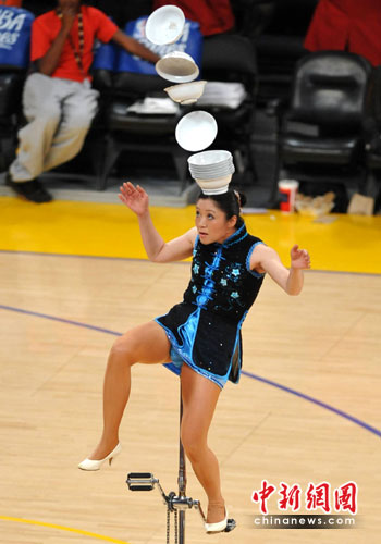 当地时间5月19日晚,在NBA西部决赛第二场比赛中,洛杉矶湖人再次战胜菲尼克斯太阳队,取得二连胜。图为中场休息时,杂技演员表演中国传统杂技“顶碗”为比赛助兴。中新社发 张炜 摄