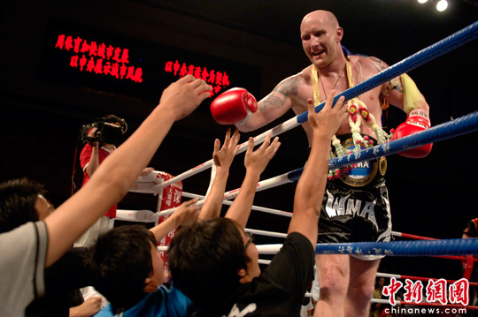 5月22日晚,获得世界职业泰拳拳王争霸赛漳州站重量级冠军的澳大利亚选手与漳州泰拳爱好者零距离。当晚,世界职业泰拳拳王争霸赛在福建漳州打响,来自12个国家的12位男女职业泰拳手充分展现了泰拳凶狠、勇猛的格斗技巧,为漳州观众献上了一道丰盛的泰拳饕餮大餐。中新社发 王东明 摄