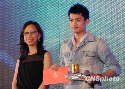 5月24日,征战世界羽毛球汤姆斯杯、尤伯杯归来的中国羽毛球队庆功会上林丹(右)荣获“最具激情运动员”称号。当日,总教练李永波、男队主力林丹与媒体见面,分享男队第八次夺得汤姆斯杯的难忘经历。中新社发 侯宇 摄