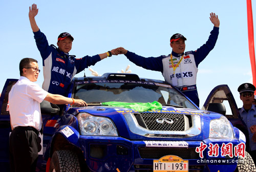 5月28日,2010中国环塔拉力赛在新疆哈密木卡姆艺术中心举行发车仪式,中国威麟车队的09年年度冠军、一号种子选手江耀桓(右)第一个发车引人注目。中新社发 赵振清 摄