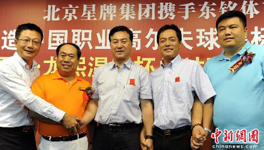 6月8日,中国职业高尔夫球锦标赛单站冠名签约仪式在国家体育总局举行。中国职业高尔夫球锦标赛第三站比赛,将于6月10日至13日在北京龙熙温泉高尔夫球会举行。据悉,这一赛事年内还有3次比赛。高尔夫球已成为2016年奥运会项目。图为国家体育总局小球运动管理中心主任张小宁(中)出席签约仪式。中新社发 刘震 摄