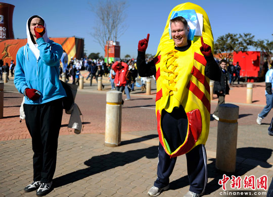 6月17日,南非约翰内斯堡足球城一位球迷将自己打扮成球鞋造型。当日,南非世界杯B组第二轮阿根廷对韩国的比赛将在足球城球场举行。中新社发 廖攀 摄