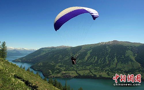 6月中旬,一位滑翔伞爱好者在新疆喀纳斯湖上空试飞,“2010年中国优秀滑翔伞选手赛”将于8月在被誉为“人间净土”的新疆喀纳斯景区举行。据喀纳斯景区管委会介绍,该景区无论从地形、风速、落差等方面都具备滑翔伞运动的基本条件,希望通过此次赛事能吸引更多的滑翔伞爱好者到此一展身手。同时景区欲在明年举办国际性的滑翔伞赛事,并计划用3至5年的时间将喀纳斯打造成国际性的滑翔伞赛事基地。中新社发 刘新 摄