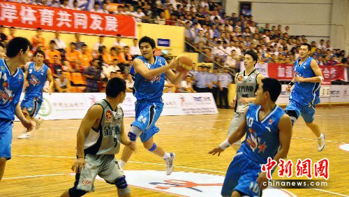 6月21日至23日,海峡两岸体育交流大赛·篮球挑战赛在福建莆田举行,共吸引了福建SBS浔兴篮球俱乐部篮球队、台湾璞园建筑篮球队、金门酒厂篮球队、莆田市代表队等4支队伍参加。图为两岸篮球队员展开激烈的拼抢。中新社发 林剑冰 摄