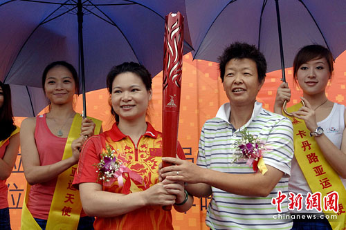 6月27日,广州亚运会“亚洲之路”典藏特装车增城绿道巡游暨2010广州增城荔枝文化旅游节开幕式在增城广场隆重举行。前奥运举重冠军陈小敏与前女足亚运冠军队员施桂红携亚运火炬亮相。中新社发 刘卫勇 摄