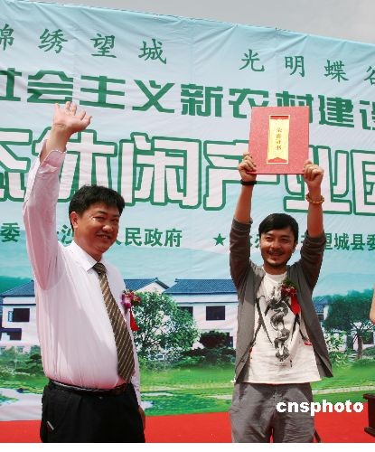 5月31日,湖南第一个真正按照“资源节约、环境好友”模式打造的“两型”村庄望城县光明村正式开村。湖南卫视著名主持人汪涵(右)成为该村荣誉村民。中新社发 刘双双 摄