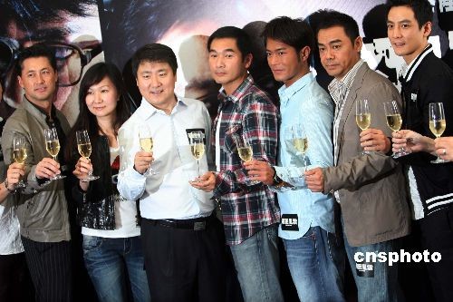 6月2日,香港著名影星吴彦祖、刘青云、古天乐、方中信、王敏德与投资商博纳影视娱乐老板于东(左三)在记者会举杯祝贺,为在七月暑期上映的电影《窃听风云》造势宣传。 中新社发 洪少葵 摄