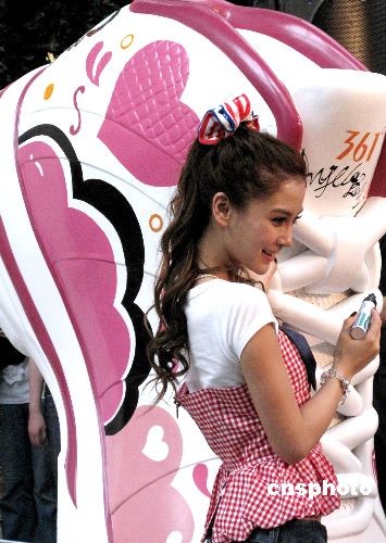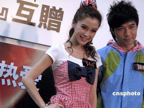 六月十四日,香港一家商场举办一专业体育用品品牌运动鞋慈善系列活动,图为歌手古巨基与模特Lcon Angelababy参加活动。中新社发 张勤 摄