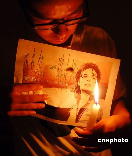 2009年6月26日,重庆市歌迷点起烛光,悼念逝去的美国歌星迈克尔•杰克逊,祝愿其在天堂快乐。当日,美国著名流行歌星迈克尔•杰克逊(Michael Jackson)因心脏病发作在洛杉矶分校医疗中心一家医院去世。中新社发 许康平 摄