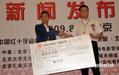 8月28日,香港影星甄子丹(左)被中国红十字会授予“中国红十字会爱心传播传播大使”,并在现场向当日正式启动的“中国红十字传播基金”捐赠港币一百万元。由中国红十字会总会与一通明堂(北京)文化传媒有限公司联合发起成立的该基金,将公益与企业文化、与娱乐经济结合,促进公众参与公益事业。中新社发 曾利明 摄
