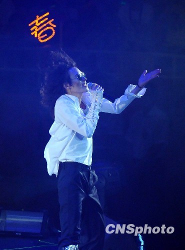 8月29日晚,“沸腾2009魅力无限北京演唱会”在北京工人体育馆举行,“超女”李宇春、周笔畅、张靓颖等应邀登台献艺。图为一名演员模仿迈克尔・杰克逊登台献艺。中新社发 侯宇 摄