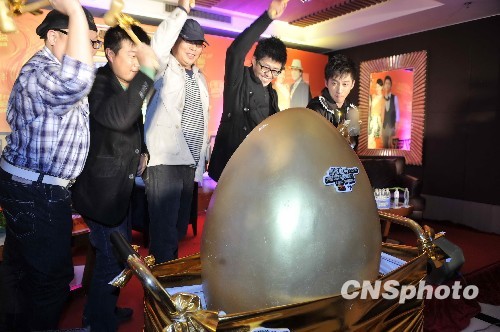 11月1日,众星在2009“康熙盛典”全国巡回演唱会北京站发布会上砸金蛋为活动开票。风靡两岸的台湾王牌综艺节目《康熙来了》现场版2009“康熙盛典”全国巡回演唱会11月28日将首度“大闹京城”,于首都体育馆掀起万人大狂欢。届时,台湾王牌综艺主持之康熙家族——小S、蔡康永、陈汉典将携手超级型男王力宏、黄立行、台湾第一偶像组合飞轮海、内地型男张振宇等多位华语乐坛巨星首度“大闹京城。中新社发 杨可佳 摄