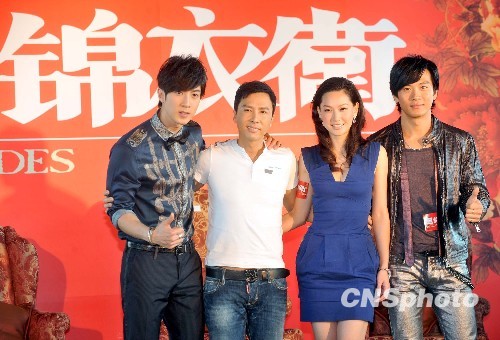 十一月十日,由中、港及新加坡合资电影《锦衣卫》在香港举行记者会。《锦衣卫》四位演员吴尊、甄子丹、徐子珊及戚玉武(左起)出席为影片宣传造势。中新社发 邓庆乐 摄