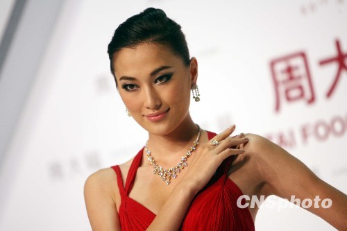 十一月十七日,当红名模戴小奕身穿红色晚装在香港会展中心演绎周大福价值千万的珠宝。当日,周大福珠宝为庆祝80周年,举办大型珠宝展。中新社发 洪少葵 摄