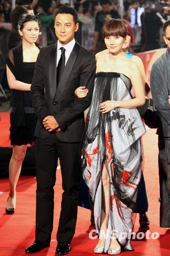 11月28日,第46届金马奖颁奖典礼在台北县举行,众星云集。图为电影《如梦》男女主角吴彦祖、袁泉相挽出席。中新社发 黄少华 摄