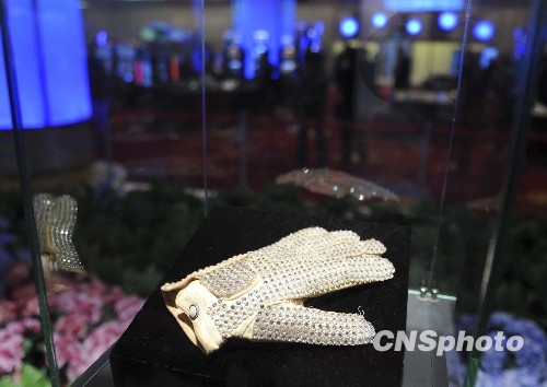 12月15日,何鸿燊家族刚刚拍得的迈克尔·杰克逊在1983年首次演出Moonwalk Dance时所戴的水晶白手套在新张的海立方娱乐场内展出。中新社发 廖攀 摄