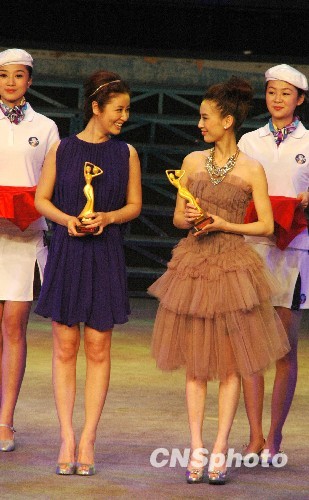 12月18日晚,第五届中国(三亚)国际电视广告艺术节颁奖晚会在三亚美丽之冠文化会展中心举行。图为获得“最佳广告代言人奖”的林心如(左二)、黄圣依(右二)喜获奖项。中新社发 尹海明 摄