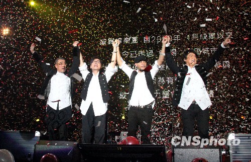 由著名华语流行音乐歌手李宗盛、罗大佑、张震岳、周华健(自左至右)组成的台湾纵贯线演唱组(Super Band乐团),三十日晚间在台北市小巨蛋举行最后一场演唱会后,完美谢幕,宣布解散。中新社发 曾嘉 摄