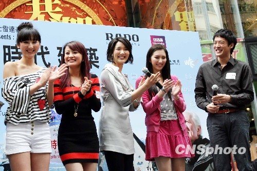 2月26日,香港无线电视艺人(左起)高海宁、陈倩扬、李亚男、何傲儿、陈智燊在世贸中心广场出席BBC纪录片《划时代建筑》启播礼。3月初播出的《划时代建筑》,将全面介绍世界各地极具代表性的建筑,包括中国历史建筑。中新社发 洪少葵 摄