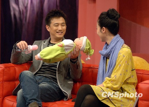 日前,黄磊夫妇受邀参加了星空卫视美女脱口秀节目《lady呱呱》的节目录制,与“宝岛第一性感女神”之称的台湾女星天心和另外3位美女主播大聊情感话题。话题虽然温馨但尺度火辣,黄磊孙莉更是被天心问及初吻日期,不过二人却给出了日期相差一天的不同答案,引起了现场一段情史大回忆。谈及女儿多多,夫妇俩更是一脸幸福,黄磊随后和天心分享起了他的育儿经,并现场当起“奶爸”示范给婴儿喂奶。图为黄磊现场示范给“宝宝”喂奶。中新社发 李学仕 摄