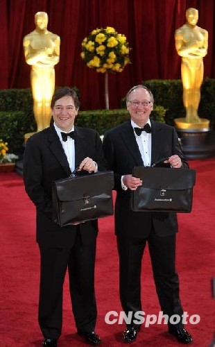 当地时间3月7日晚,第82届奥斯卡金像奖在好莱坞揭晓。普华永道会计师事务所的资深会计师手提奥斯卡最终计票结果步入柯达剧场。他们两位是唯一提前知道投票结果的人士。中新社发 张炜 摄
