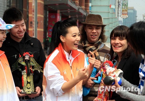 3月18日,著名歌唱家、上海世博会志愿者宣传大使谭晶,在上海拍摄世博会志愿者主题歌《世界》MV。谭晶在拍摄现场当起中外志愿者们的“老师”,教他们如何展示最美微笑。中新社发 潘索菲 摄