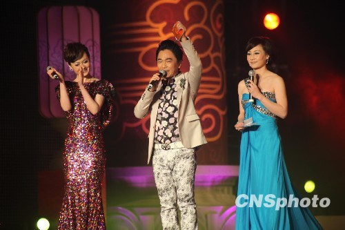 4月15日,“妈祖之光·世遗之华”大型电视晚会在台湾台中县大甲镇体育场举行,这是“妈祖之光”电视晚会连续五年第六次走进台湾,第三次在台中举办。图为知名台湾综艺节目主持人吴宗宪、台湾东森电视台主持人吴宇舒、福建海峡电视台主持人赵娜一起主持晚会。中新社发 罗钦文 摄