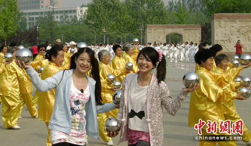 5月15日,《中国时报》、《旺报》、中天电视等台湾媒体“24个大陆魅力城市访问行”来到有“中国冠军之城”河北保定,对该市空竹、健身球、太极拳等群众性体育运动的广泛普及产生浓厚兴趣。图为台湾中天电视双胞胎女主持人现场“秀”铁球。中新社发 吕子豪 摄