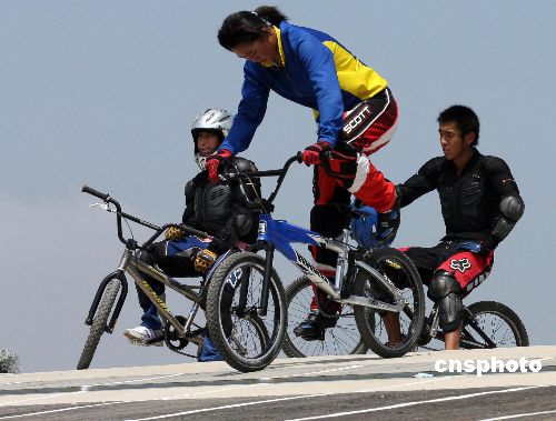 8月2日,位于北戴河奥运公园的小轮车训练场内,来自北京队、河北队的十几名队员顶着烈日在紧张训练。小轮车(BMX)竞速运动起源于上世纪60年代的美国,原是街头的杂耍,2003年开始传入中国,现已经列入奥运比赛项目。这项极富刺激和观赏价值的运动项目将在2008年的北京奥运会上首次现身。中新社发 周雪峰 摄