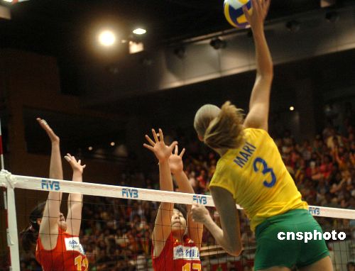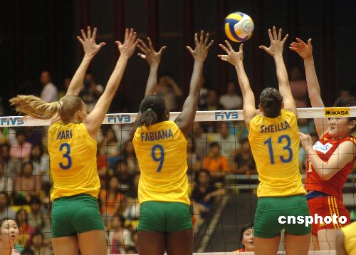 八月二十七日,在澳门举行的2006世界女排大奖赛上,巴西女排以三比零胜中国女排,获澳门站比赛冠军,中国女排屈居亚军。中新社发 史利 摄