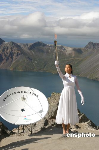 九月六日上午,第六届亚洲冬季运动会圣火采集仪式在长白山天池顶峰举行,圣火采集者郭蕊利用太阳能取火器将取火棒点燃,这标志着第六届亚冬会火炬传递正式拉开了序幕。十月十九日,亚冬会组委会将在北京中华世纪坛举行隆重的亚冬会火炬点火仪式。届时,国家领导人将亲手点燃亚冬会火炬。中新社发 吴兆飞 摄