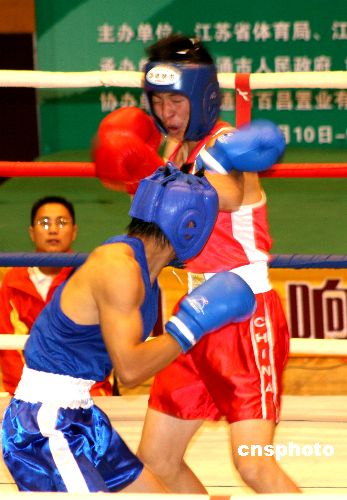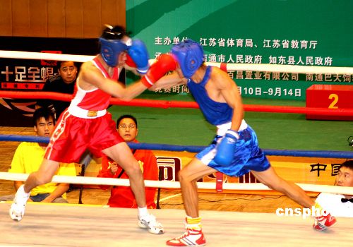 2006年9月10日下午,江苏“十六运”青少年部拳击比赛在如东体育馆拉开帷幕。中新社发 王必春 摄