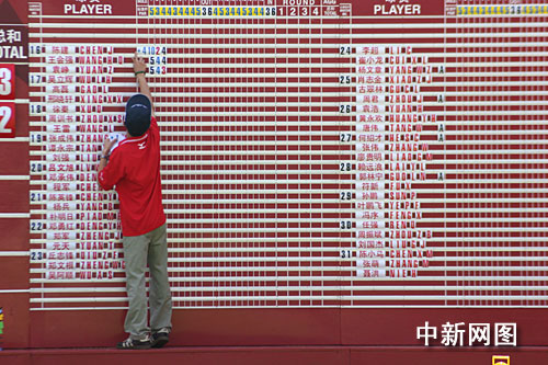 包括11名非职业球手在内的92名球员,2006年9月21日在云南昆明乡村高尔夫俱乐部挥杆开战,从而拉开2006欧米茄中国高尔夫巡回赛昆明站的战幕。图为赛场计分牌实时更新,显示最新战况。 余瑞冬 摄