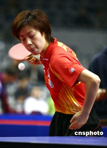 九月二十九日,二○○六女子世界杯兵乓球赛在新疆体育中心拉开战幕,首场比赛由中国选手张怡宁对阵日本选手福原爱,最终张怡宁以四比零的成绩轻松战胜“瓷娃”福原爱。中新社发 刘新 摄