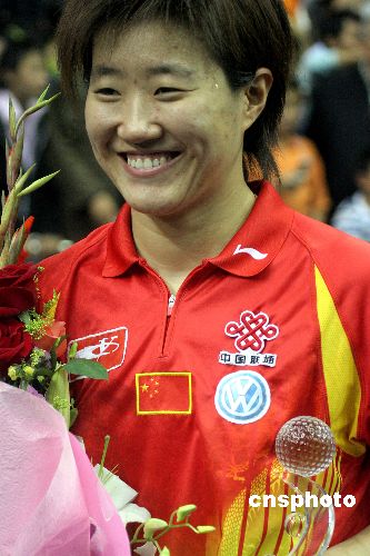 十月一日晚,二○○六女子世界杯兵乓球赛决赛在新疆体育中心拉开战幕,排名世界第一的中国选手张怡宁与队友郭焱苦战七局,最终郭炎实现大逆转以四比三战胜张怡宁获得冠军,同时也收获了个人首个世界冠军,并拿下了四点四万美元的奖金。中新社发 刘新 摄