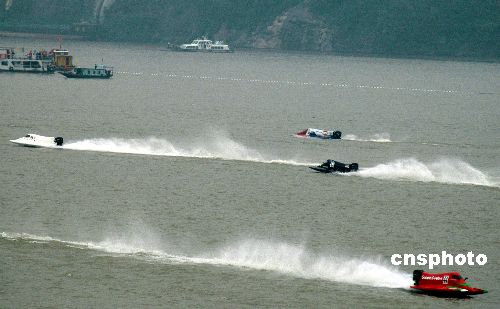 10月3日,2006 F2摩托艇世界锦标赛在重庆市万州正式开赛,16个摩托艇队在长江上展开角逐。“F2摩托艇世界锦标赛”为系列赛事,起始于2002年,是由国际摩托艇联合会组织的集竞争性、观赏性和刺激性于一体的体育竞赛项目。中新社发 郭晋嘉 摄