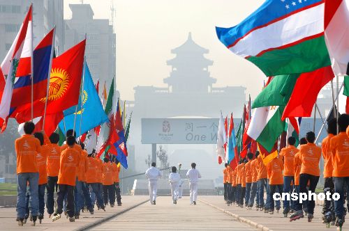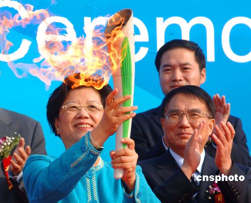 10月19日,国务委员陈至立在北京中华世纪坛点燃第六届亚洲冬季运动会火炬。第六届亚洲冬季运动会,将于2007年1月28日至2月4日在吉林省长春市举办。中新社发 廖攀 摄