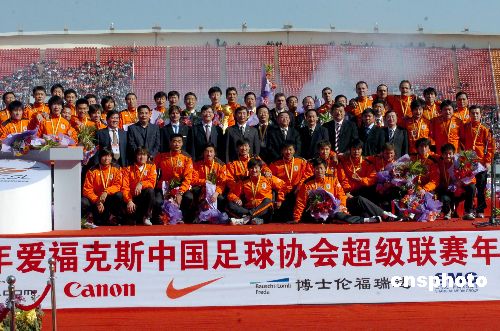10月29日,2006中国足球超级联赛颁奖仪式在山东济南隆重举行。各参赛俱乐部球员、教练汇聚一堂,共迎辉煌一刻。中新社发 张侃 摄
