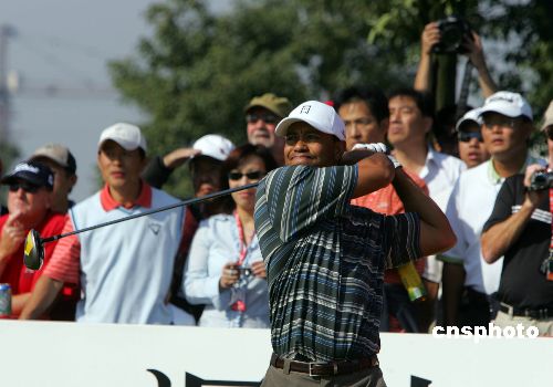 十一月八日,当今世界高尔夫第一人,“老虎”伍兹在上海佘山高尔夫球场参加“二○○六汇丰冠军赛”配对赛,为即将举行的正赛热身。伍兹的到来吸引了众多“老虎迷”到现场助阵。中新社发 汤彦俊 摄