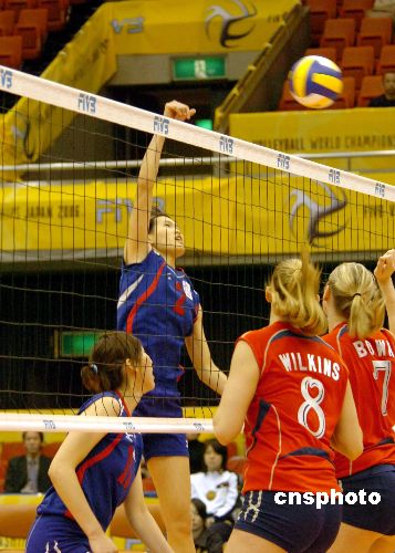 十一月十五日,中国台北女排在日本大阪府立体育馆进行的世锦赛九至十二名定位赛上零比三不敌美国女排。中新社发 王健 摄