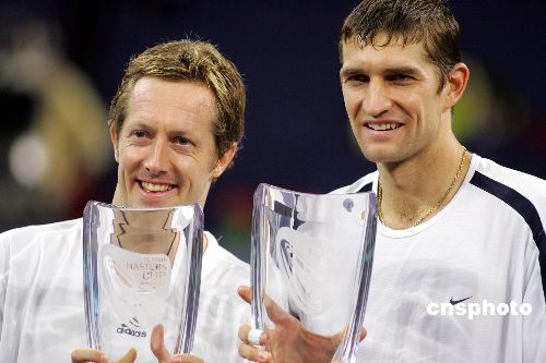 十一月十九日,在上海旗忠网球中心进行的大师杯双打决赛中,比约克曼和米尔尼这对“老将组合”以二比零战胜诺尔斯、内斯特,获得二○○六网球大师杯双打冠军,这也是他们首次捧起大师杯。中新社发 汤彦俊 摄