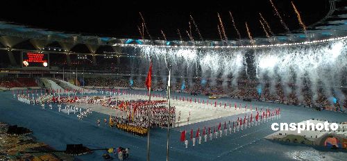 2006年11月18日晚,广东省第12届运动会在佛山世纪莲体育中心隆重开幕。开幕式上大型文体表演《铸造辉煌》精彩纷呈。中新社发 吴峻 摄